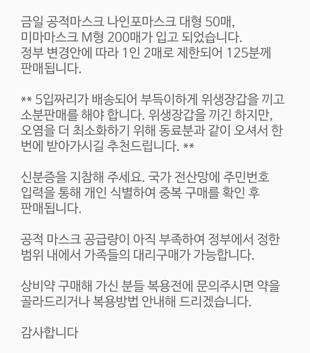 | 금일 공적마스크 나인포마스크 대형 50매, 미마마스크 M형 200매가 입고 되었습니다. 정부 변경안에 따라 1인 2매로 제한되어 125분께 판매됩니다. ** 5입짜리가 배송되어 부득이하게 위생장갑을 끼고 소분판매를 해야 합니다. 위생장갑을 끼긴 하지만, 오염을 더 최소화하기 위해 동료분과 같이 오셔서 한 번에 받아가시길 추천드립니다. ** 신분증을 지참해 주세요. 국가 전산망에 주민번호 입력을 통해 개인 식별하여 중복 구매를 확인 후 판매됩니다. 공적 마스크 공급량이 아직 부족하여 정부에서 정한 범위 내에서 가족들의 대리구매가 가능합니다. |