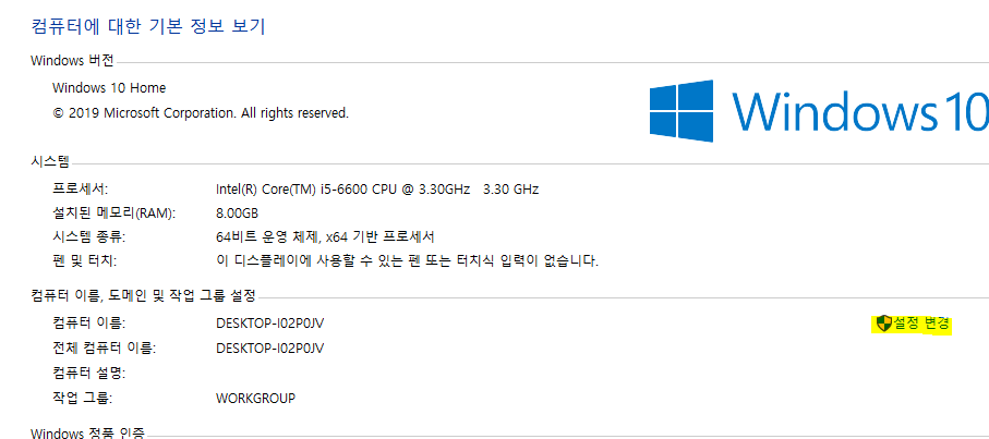 내 컴퓨터의 우클릭을 한 후, 설정변경을 누릅니다.