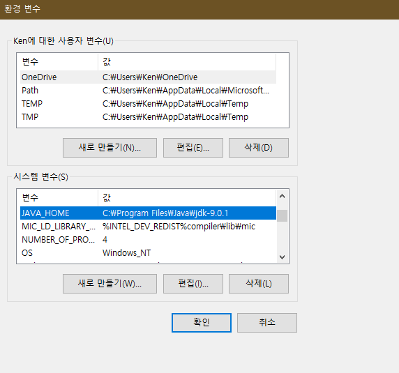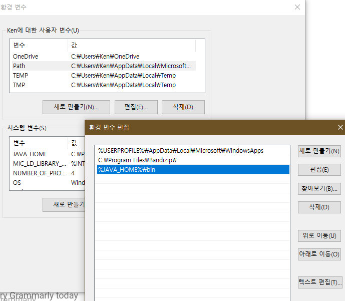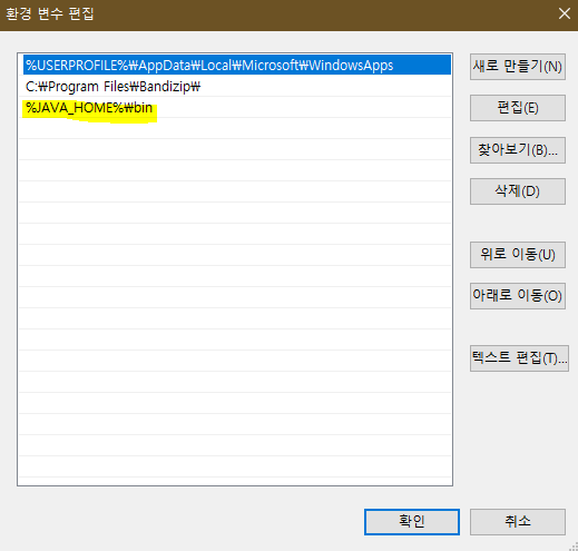 그리고 아래와 같이 사용자변수의 Path변수에 %JAVA_HOME%\bin 을 입력합니다.