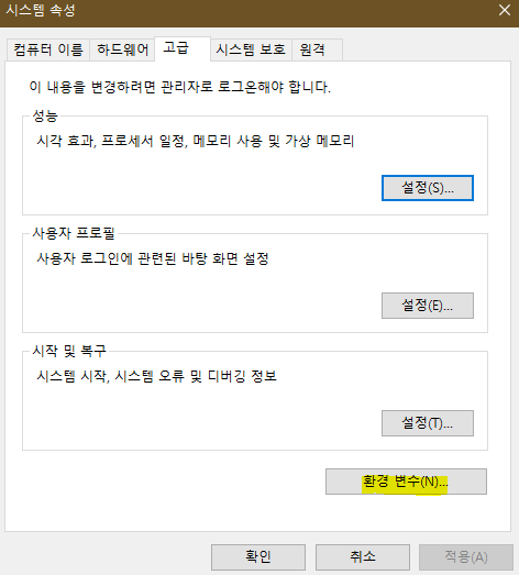 시스템 속성 화면에서 [고급] 탭을 선택 한 후, 환경변수를 클릭합니다.