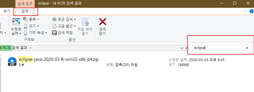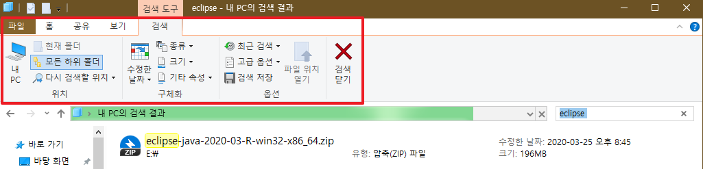 이름만 가지고 검색하기에는 너무 시간이 오래걸린다고 생각하실 수도 있어요. 좀 더 명확한 조건을 가지고 검색을 하고 싶기도 하실 거고요. 그런 검색을 하고 싶은 분들은, 위의 상단 바를 확인하시면 됩니다. 검색도구-검색 탭 을 확인해보시면 수정한 날짜, 파일 종류, 파일 크기, 고급 옵션 등 다양한 조건을 넣어서 검색할 수가 있습니다.