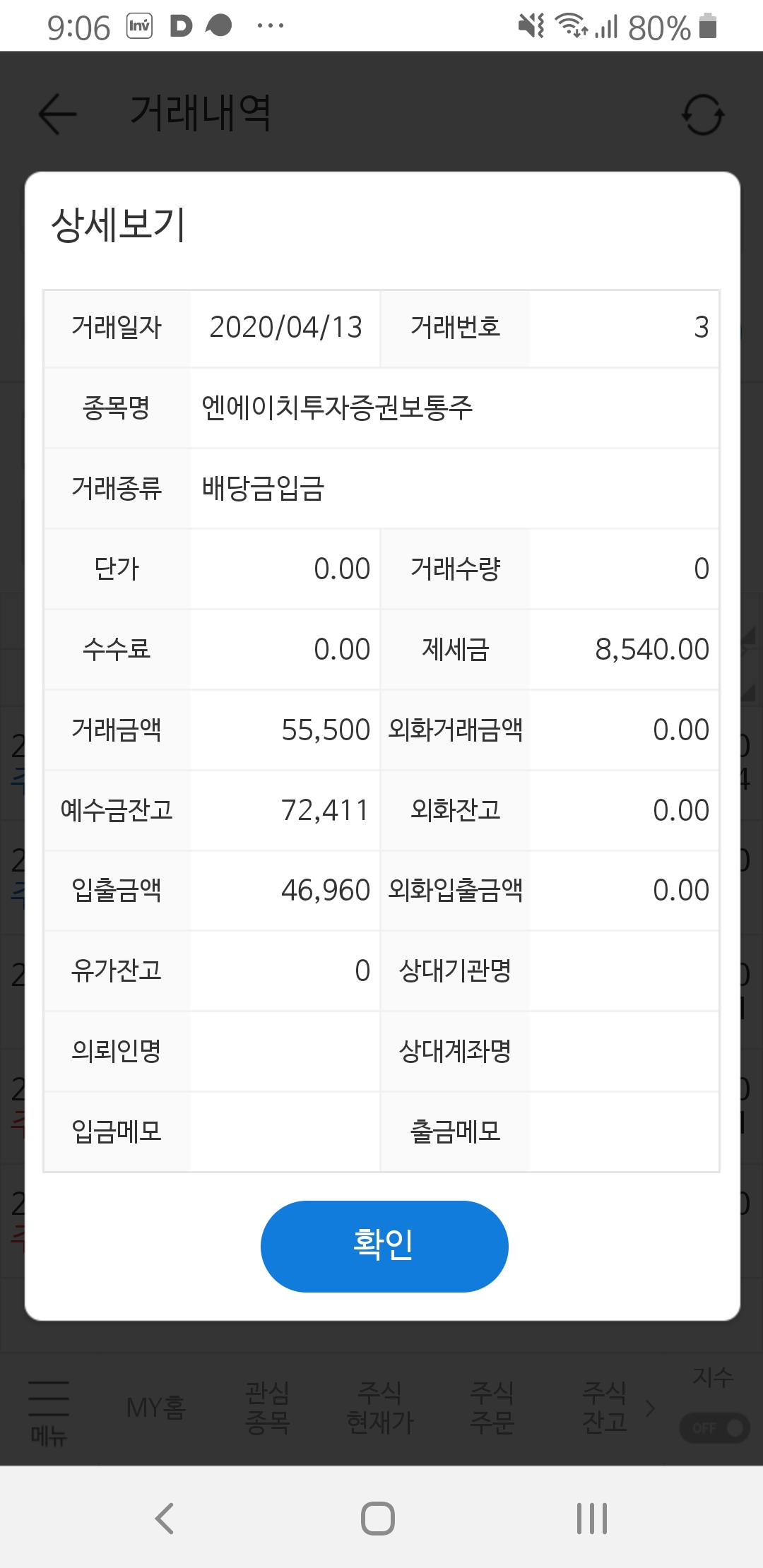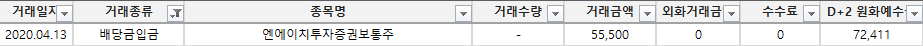 작년 2019년 배당기준일에 제가 가지고 있던 NH투자증권의 주식 수는 111주였습니다. 1주당 배당금이 500원이였으니, 저에게 지급되는 배당금은 55,500원이였습니다.
