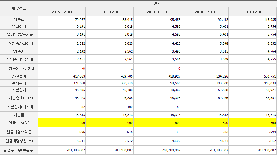 2015년 재무상태부터 보더라도 점차적으로 증가하는 영업이익을 보여주는 NH투자증권입니다. 영업이익이 우상향하는 동시에 당기순이익도 함께 증가하는 매우 안정적인 투자종목으로 볼수 있는데요. 이에 따라 배당금도 매년 주주들에게 지금하는 배당수익률도 우수한 종목으로 볼수가 있습니다.