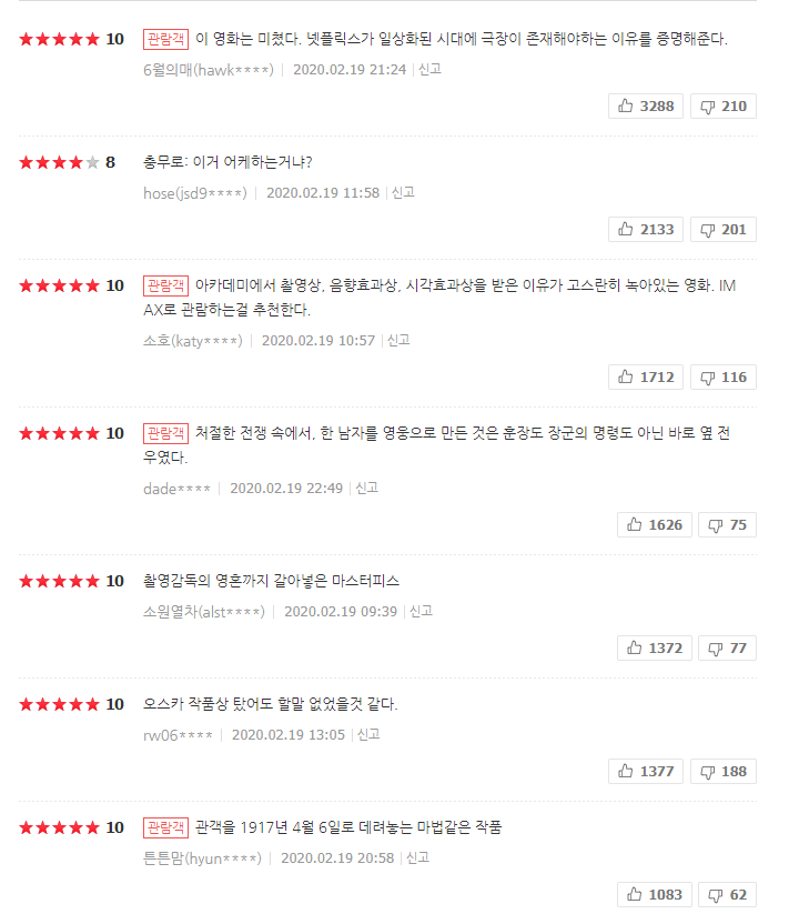 영화가 끝나고 나면, 전쟁같은 하루를 함께 경험한 느낌을 들게 해줍니다. 어떤 전쟁 영화보다 현실적으로 느껴지는 영화입니다. 아직 이 영화를 못 본 분들이 있다면 꼭 보시길 바랍니다. 추천드립니다.