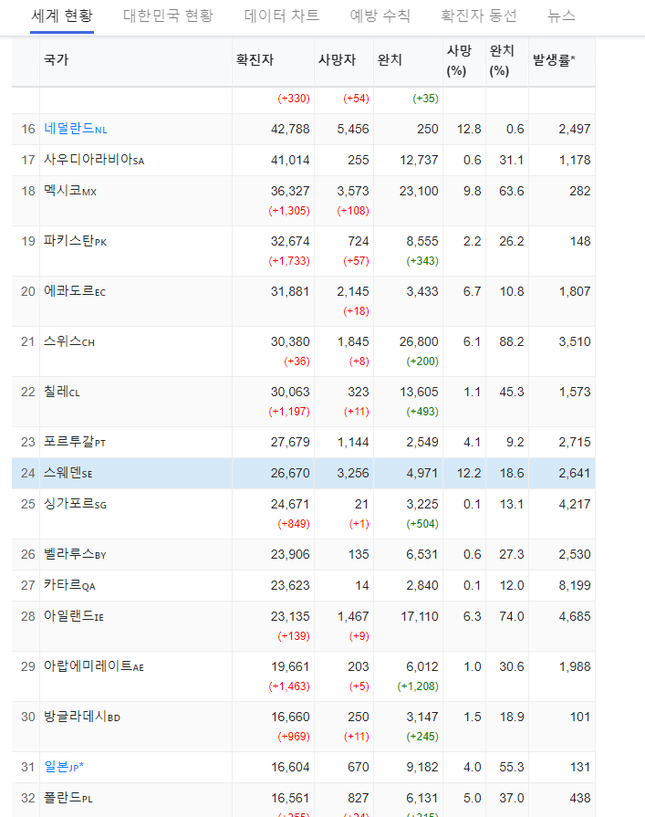 코로나19 실시간 상황판으로 확인해보면, 스웨덴의 확진자수는 26,670명, 스웨덴의 코로나 사망자는 총 3,256명입니다. 여기에서 주의깊게 봐야할 점은 사망률입니다. 12.2%로 매우 높은 수치를 보여주고 있으며, 이는 스웨덴의 집단면역 정책의 결과로 볼 수도 있다고 봅니다.