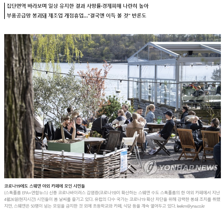 모든 나라가 코로나 19 확산을 저지하기 위해서 봉쇄조치를 시행하였지만, 스웨덴은 집단면역 효과에 더 무게를 둔 코로나19 대응정책을 추진하였습니다. 이 정책은 봉쇄조치로 인한 경제적 타격을 최소화하겠다는 의지이기도 하였는데요. 코로나에 대하여 전국민이 집단 면역이 될 것이라는 기대감으로 이 정책을 결정했던 것으로 보입니다.