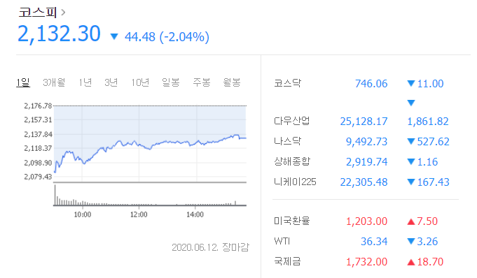 2020년 6월 12일, 나스닥이 대폭락하였습니다. 코스피 지수도 함께 하락하였습니다. 12일에는 코덱스 인버스를 467주를 매도하며, 112,850원 수익 실현하였습니다. 더 끌고 갈수 있었으나.. 인버스 투자를 장기적으로 가져가는 패턴의 투자를 싫어하는 편이라.. 만족할만한 수익금을 실현하며 매도하였습니다. 신기하게도 매도를 하자마자 코스피가 오르더라구요. 오늘은 운이 좋은 날이였던 것 같습니다.