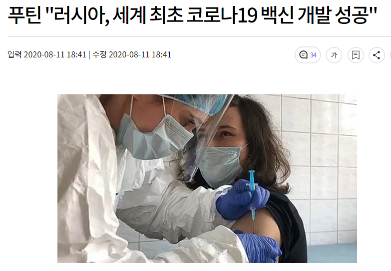 러시아가 세계 최초 코로나 백신을 등록했다고 합니다.