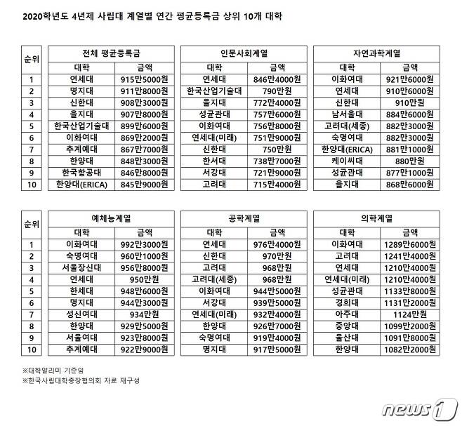 다음은 사립대 계열별 연간 평균등록금 순위이다. 1위는 연세대이다. 연세대의 평균등록금은 915만원. 명지대와 신한대 을지대도 900만원대이며, 그 뒤로 한국산업기술대, 이화여대, 추계예대, 한양대가 800만원대 중후반.