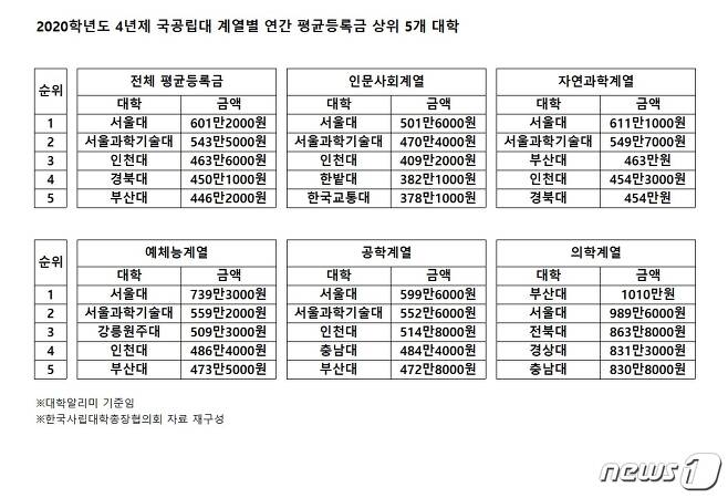 1. 국공립 대학교 등록금 순위