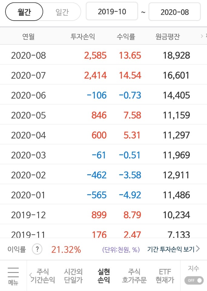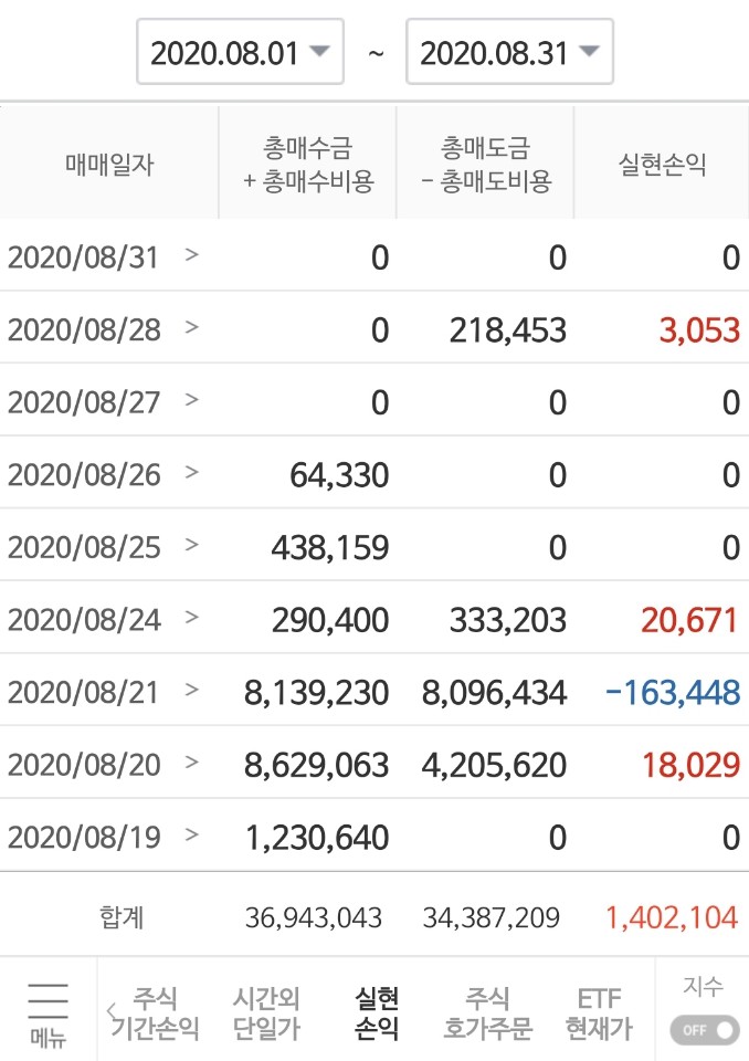 2020년 8월에는 140만원의 수익을 실현할 수가 있었다.
