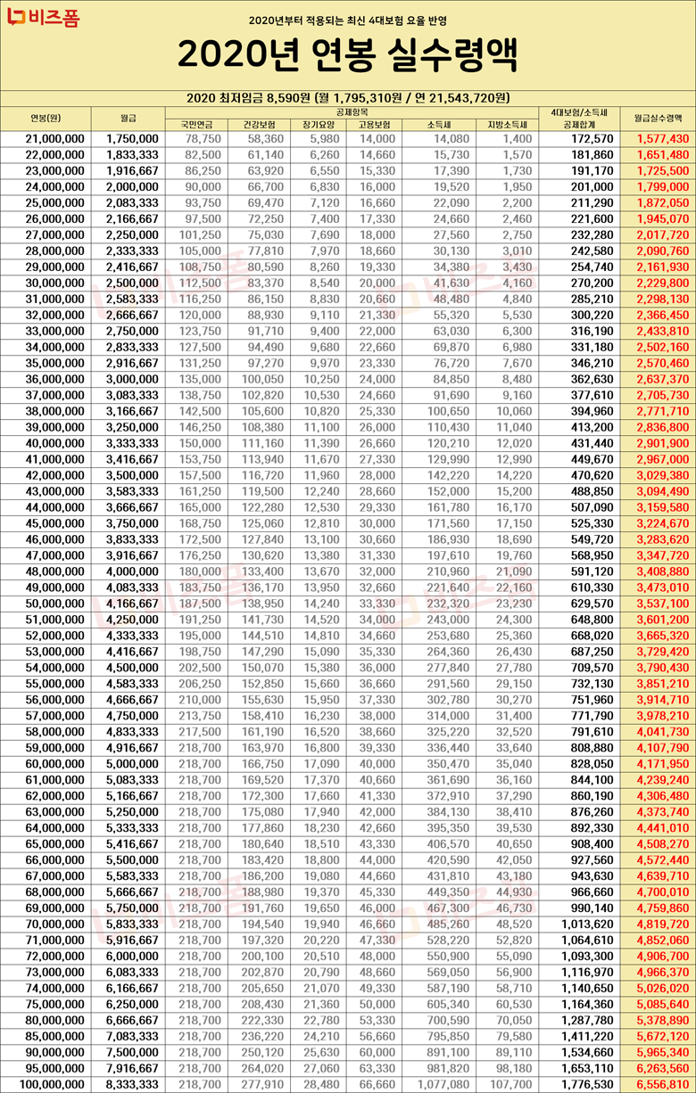 2020년 연봉실수령액 표