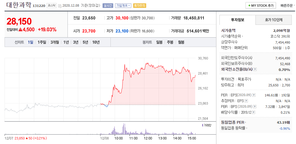 19% 상승한 대한과학. 영업이익이 낮은 것은 아쉬우나, 재무비율은 우수하다. 그리고 시가총액이 가벼운 편이라는 점이 가치테마투자기법으로 봤을 때는 우수한 종목으로 보인다.