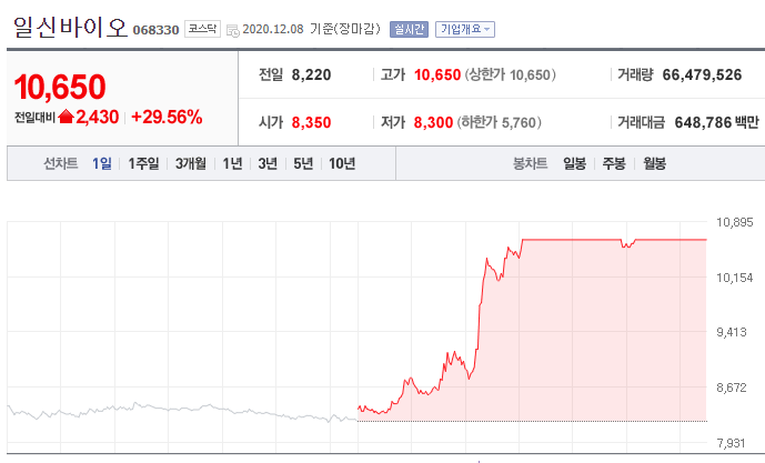 일신바이오는 물이 들어올 때 노를 저을 줄 아는 것 같다. 일신바이오는 초저온 냉동고 관련 국내 특허를 지난 7일 취득했다고 8일 공시했다. 이 특허는 영하 10도에서 영하 90도까지 백신 등을 보관할 수 있는 초저온 냉동고에 관한 것으로, 냉각 방식을 효율적으로 활용하는 것이 가능하다고 한다. 8일 공시 뉴스가 나오자마자 상한가로 돌입됐다.