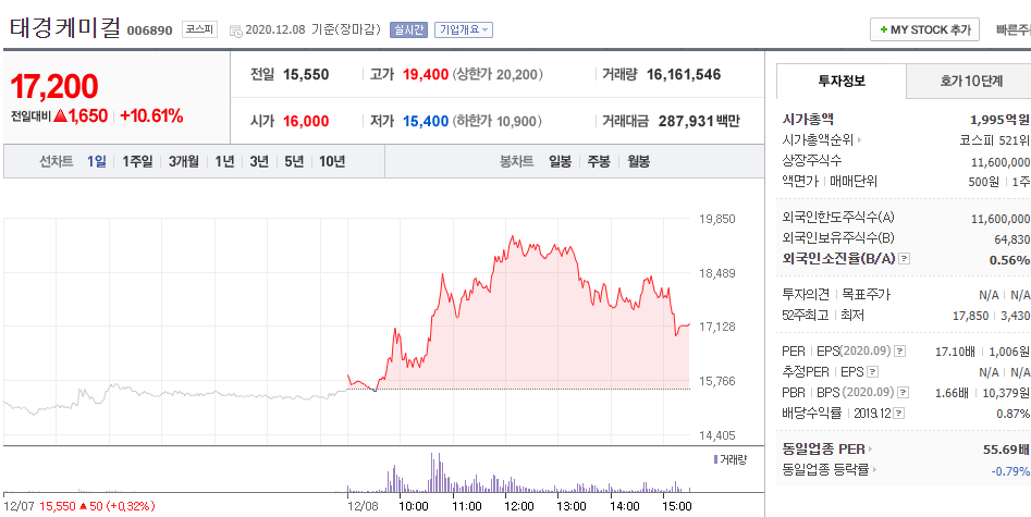 10% 상승한 태경케미컬. 시가총액이 굉장히 가볍다. 재무비율이 상당히 양호한 편으로 보인다. 재무제표를 면밀히 더 확인해보고 싶은 종목이다.