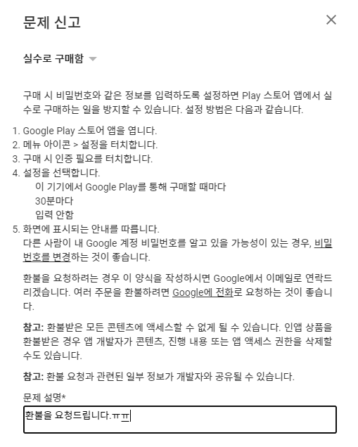 그리고 문제 신고를 설명하는 란에 환불을 요청한다고 기입한 후 제출합니다.