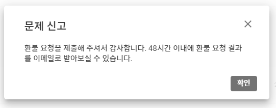 제출을 누르면 문제 신고가 제출되었다고 팝업이 나옵니다. 48시간 이내에 환불 요청 결과가 나온다고 합니다..