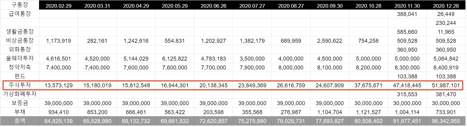 나는 2018년부터 주식 투자에 대해서 공부하기 시작했다. 소액으로 가치 투자와 스윙 투자에 대해서 실천을 해보며 투자하였고 2019년부터 조금씩 자산이 늘어났다. 목표 수익률을 낮게 잡고 분할 매수와 분할 매도를 습관하하여 돈의 크기를 불려온 것이다. 나의 자산은 2020년 급격하게 증가하였다. 내가 하던대로 주식투자를 했는데 주식시장의 우상향으로 인하여 자연스럽게 돈이 쌓이는 속도가 빨라진 것이다. 아래는 나의 2020년 자산현황 표이다. 전체 자산의 증가 속도를 알 수가 있다. 이것이 바로 복리의 무서움이다.