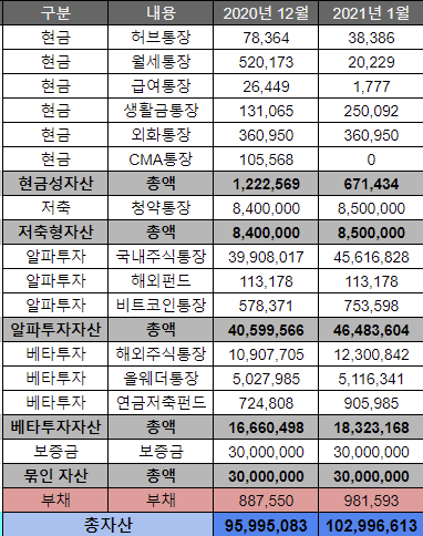 나는 2018년부터 주식 투자에 대해서 공부하기 시작했다. 소액으로 가치 투자와 스윙 투자에 대해서 실천을 해보며 투자하였고 2019년부터 조금씩 자산이 늘어났다. 목표 수익률을 낮게 잡고 분할 매수와 분할 매도를 습관하하여 돈의 크기를 불려온 것이다. 나의 자산은 2020년 급격하게 증가하였다. 내가 하던대로 주식투자를 했는데 주식시장의 우상향으로 인하여 자연스럽게 돈이 쌓이는 속도가 빨라진 것이다. 아래는 나의 2020년 자산현황 표이다. 전체 자산의 증가 속도를 알 수가 있다. 이것이 바로 복리의 무서움이다.