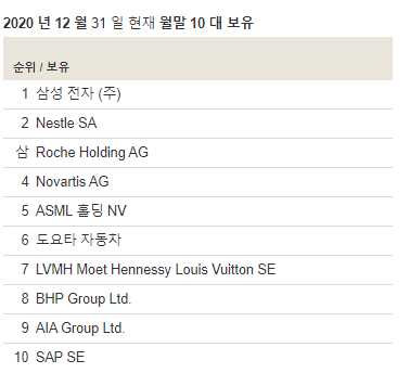 네. 삼성전자입니다. VEA는 삼성전자에 투자하는 비율이 전체 비중중 1위입니다. 자랑스러운 삼성전자네요. 삼성전자 말고도 이름을 한번쯤 들어본 주요 기업들이 상위권에 보입니다. 우리는 VEA 하나를 투자하기만해도 이런 다양한 기업을 동시에 투자하고 있는 것입니다.