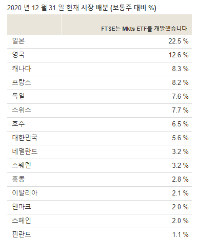 VEA ETF의 국가별 비율입니다. 일본 비중이 상당히 크네요. 일본 다음으로는 영국, 캐나다, 프랑스, 독일 등의 주요 선진국 국가들이 상위권으로 할당되어 투자하고 있습니다. 대한민국도 5%나 있네요. 대한민국의 5%는 어디에 투자중일까요?