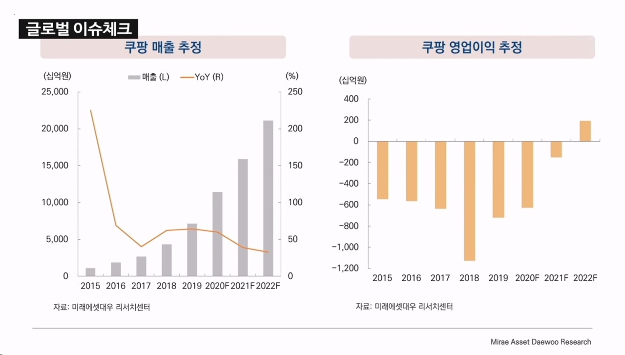 하지만 미래에셋대우 리서치센터의 자료에 따르면 실적이 점차적으로 좋아지고 있는 것이 보입니다. 이번 나스닥 상장은 쿠팡에게 자금 유동성 확보의 계기가 될 것이기에, 풍부한 자금을 기반으로 더욱 공격적인 투자와 개선된 실적이 기대된다는 의견도 많습니다.