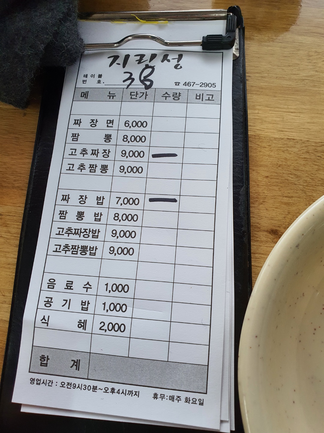 가격 : 고추짜장 : 9000원, 짜장면 6,000