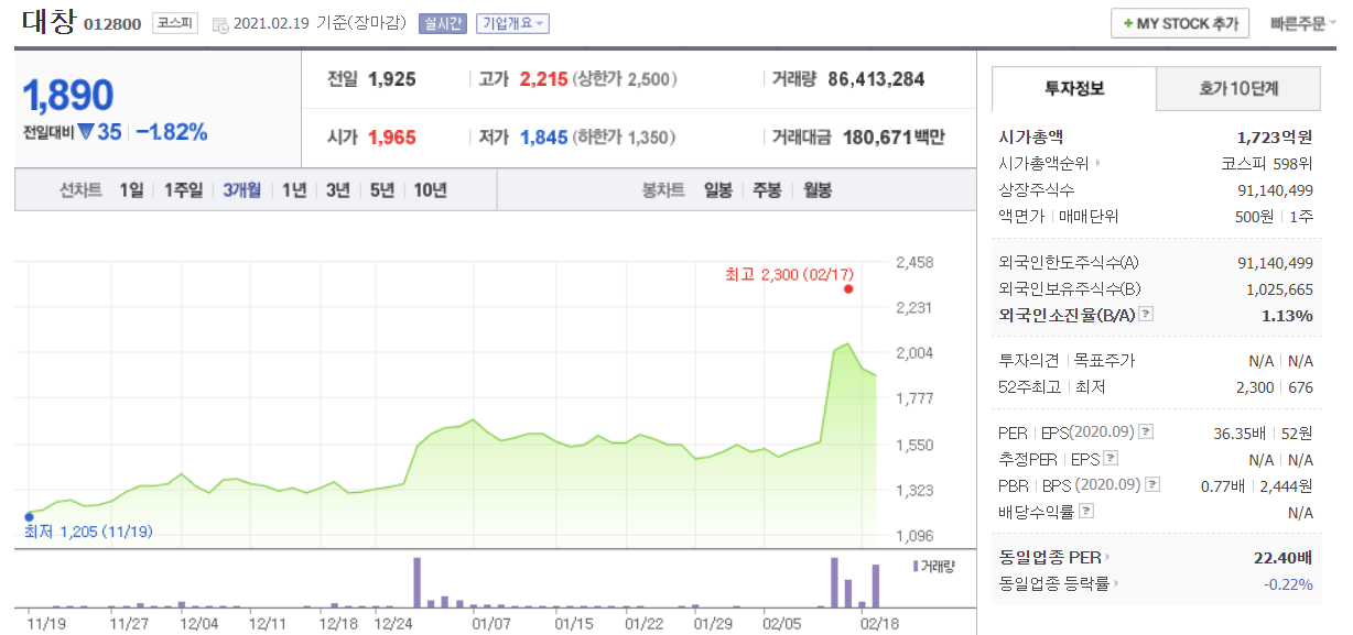 대창은 과거 저에게 제일 큰 수익을 안겨줬던 종목입니다. 1000원 이하에서 샀다가 1300원~1500원에서 매도하는 반복적 스윙투자로 큰 수익을 얻었던 종목이구요. 4년전의 저는 이런 종목들을 좋아했습니다. 시가총액이 가벼운 종목이기에 한번 모멘텀을 가지면 크게 튈 것이라는 기대감으로 샀었죠. 그리고 수익을 그만큼 얻었었구요. 저는 이번에는 풍산을 투자했지만 올해의 구리값 상승 이슈에 가장 크게 수익률을 낸 기업은 이 대창이였네요.