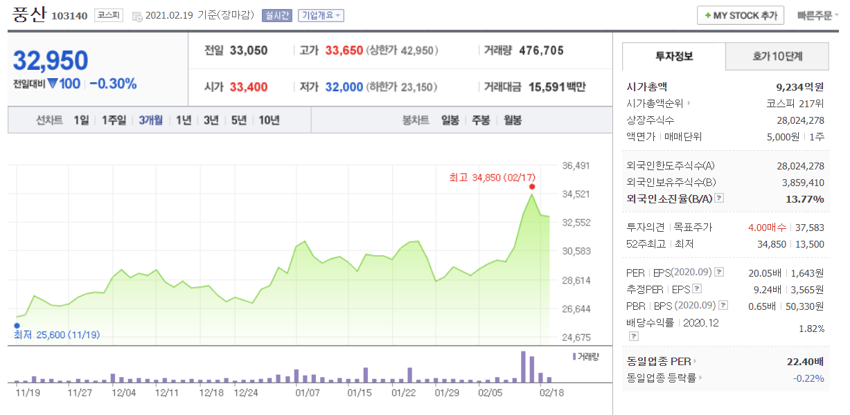 풍산은 시가총액 9,234억원으로 구리 관련주들 중 가장 가치가 높게 매겨진 기업입니다. 동일업종 PER이 22.40인 것에 비해 추정 PER이 9.24로 확인되고 있는 상황입니다. 구리 가격이 최근 급격하게 상승함에 따라 주가도 꾸준히 우상향하고 있습니다. 저도 지난달 풍산으로 이익을 봤었기에 고마운 종목입니다.