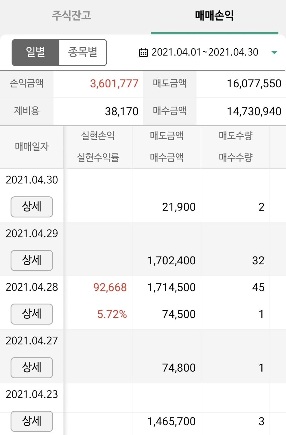2021년 4월 주식실현수익 : +3,601,777원