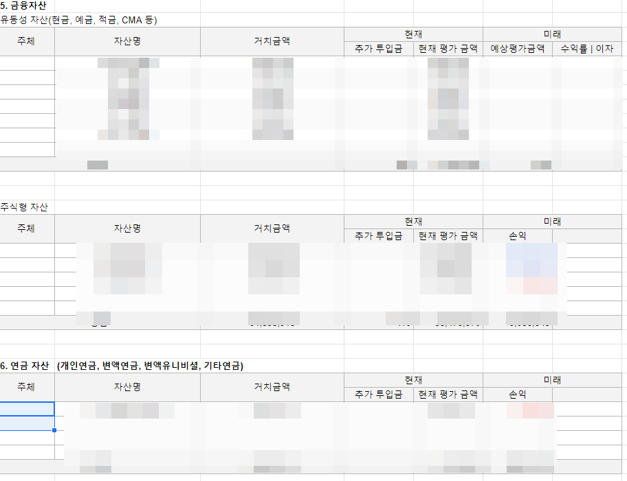 연금자산, 부동산자산, 보험자산, 기타 자산, 부채를 모두 정리하였고