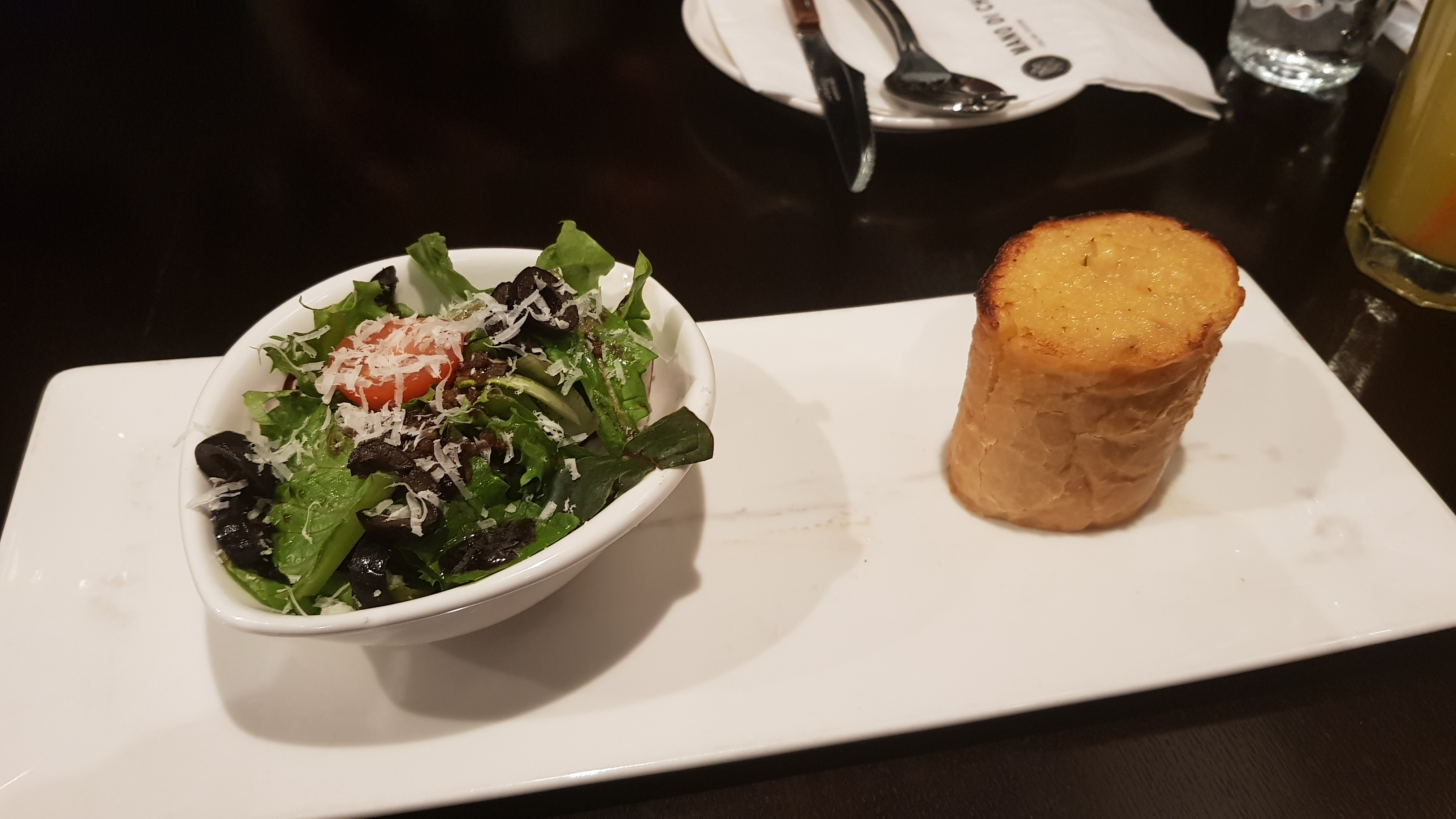 메인 음식이 나오기 전에 나오는 샐러드와 마늘빵입니다.