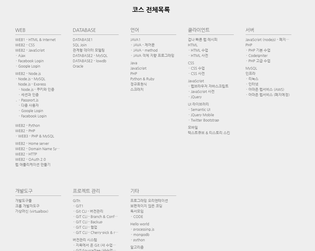 생활코딩에서 제공중인 WEB강의들은 IT지식에 대한 기반을 튼튼히 다지고 싶은 분들에게 정말 좋은 커리큘럼으로 준비되어 있더라구요.